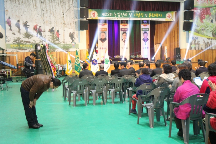 2017년 11월 11일(토) 11:00 인제체육관에서 본의회 한의동의장 및 이춘만의원, 최덕용의원, 최종열의원은 【제22회 농업인의 날 기념행사 및 문화공연 행사】에 참석하여 축하 격려해 주었다.