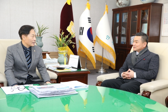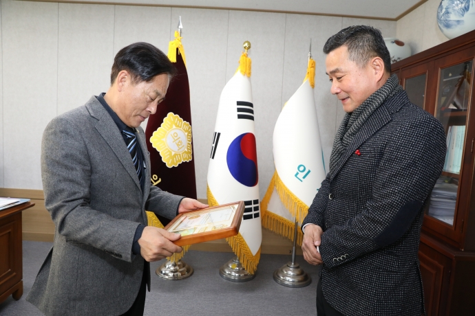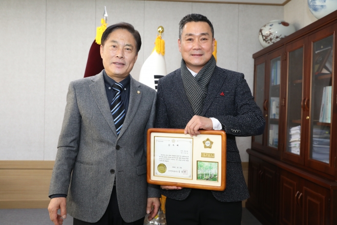 2019년 1월 23일(수) 11:00 본의회의장실에서 김상만의장은 북면 용대2리 장범용전이장에게 그간에 노고에 감사패 전달을 하였다.