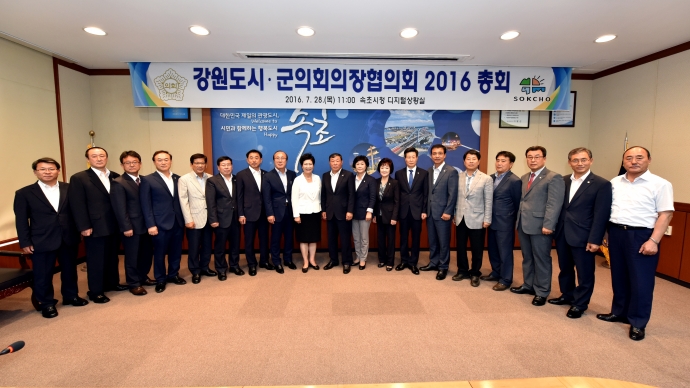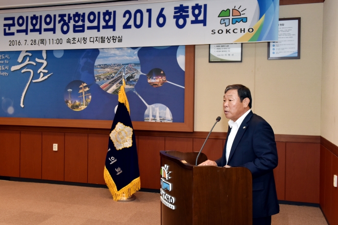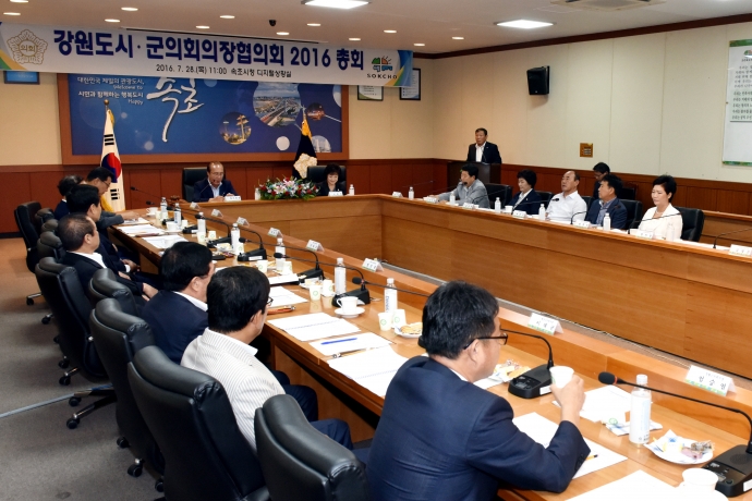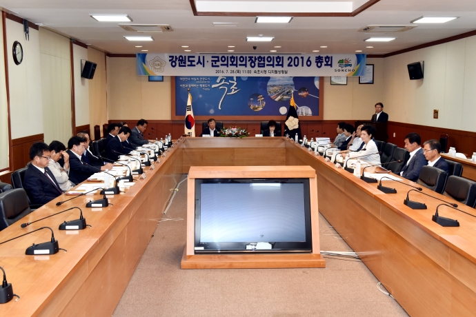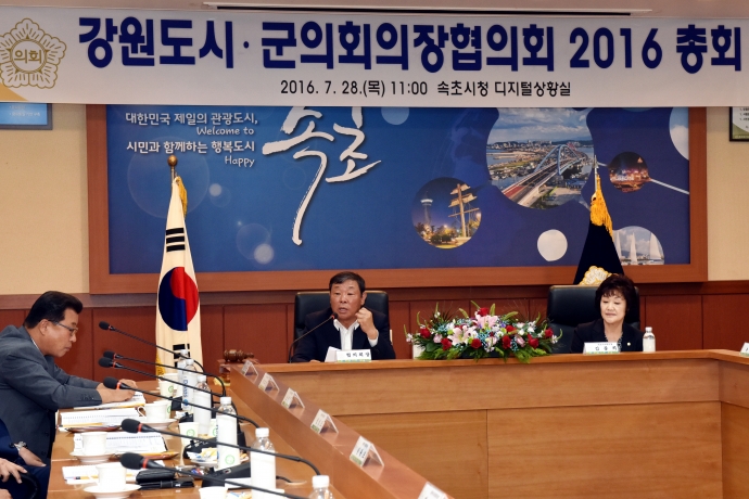 2016년 7월 28일(목) 11:00 속초시청디지털상황실에서 인제군의회 한의동의장은 【강원도시군의회의 의장협의회 2016총회】에 참석하여 강원도협의회의장으로서 총회를 주관하여 회의를 가졌다.