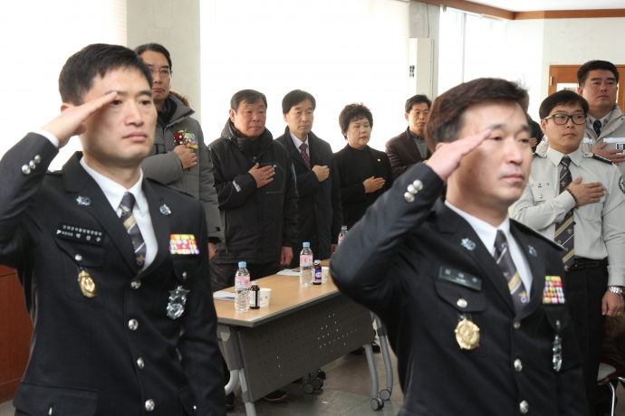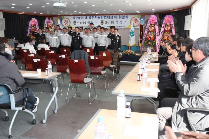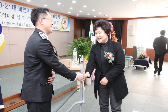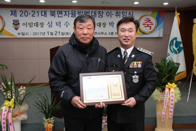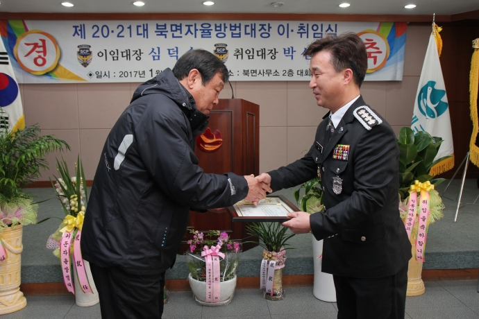 2017년 1월 21일(토) 11:00 북면행정복지센터에서 군의회한의동의장과 강순복군의원은 【북면 자율방범대장 이.취임식】에 참석하여 축하 격려해주었다.