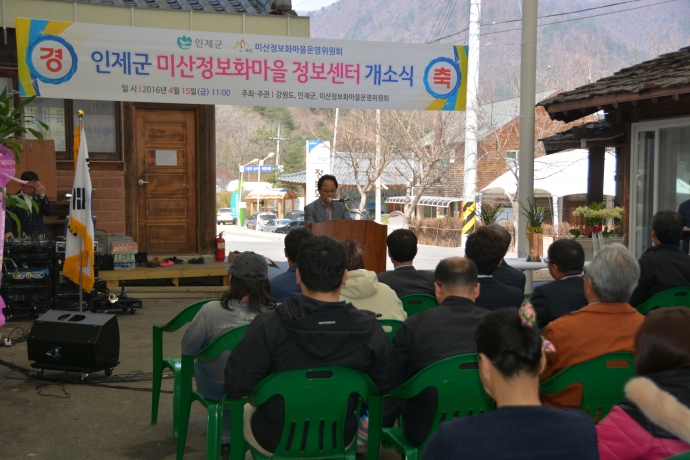 2016년 4월 15일(금) 11:00 미산1리 정보센터에서 인제군의회 최종열의원은 『미산1리 정보화마을 정보센터 개소식』에 참석하여 센터개소 축사와 더불어 주민들을 축하격려해주었다.