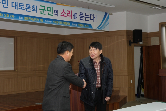 2016년 1월 28일(목) 14:00 농협인제군지부2층에서 군의회한의동의장 및 군의원들(강순복, 이기호, 이춘만, 최덕용, 최종열)은 【인제군민 대토론회】에 참석하여 인제군민의견을 들었다.