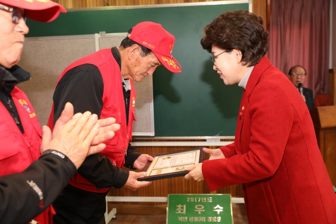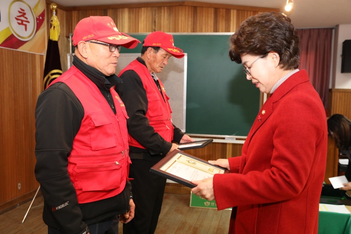 2017년 12월 28일(목) 11:00 노인회지회 3층에서 본의회 엄윤순부의장 및  강순복의원, 이춘만의원은 【노인 산불방지활동 해단식】에 참석하여 한해동안 노고에 격려해 주었다.