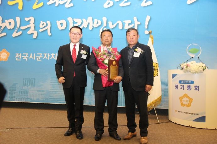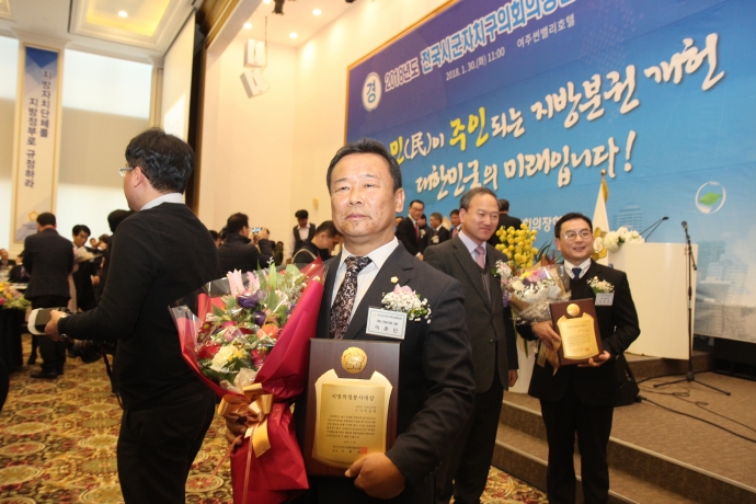 2018년 1월 30일(화) 11:00 여주쎈벨리호텔에서 본의회 한의동의장 및 이춘만의원은 【전국시군자치구의회의장협의회】에 참석하였다. 이날 이춘만의원은 전국의정봉사대상을 수상하였다.