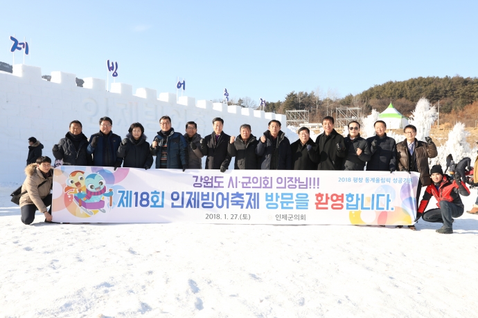 2018년 1월 27일(토) 16:30 남면 빙어축제장에서 본의회 한의동의장 및 엄윤순부의장, 강순복의원, 이기호의원, 이춘만의원, 최덕용의원, 최종열의원은 【제18회 빙어축제 개막식】에 참석하여 축하 격려해 주었다. 또한 강원도의회 18개시군의장단들도 자리를 함께 했다.