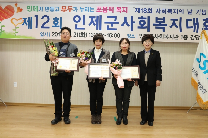 2017년 11월 21일(화) 13:30 인제군사회복지관 강당에서 본의회 엄윤순부의장 및 군의원들(강순복의원, 이춘만의원, 최덕용의원)은 【제12회 인제군 사회복지대회 개회식】에 참석하여 축하 격려 해 주었다.