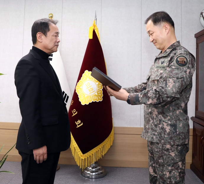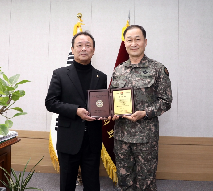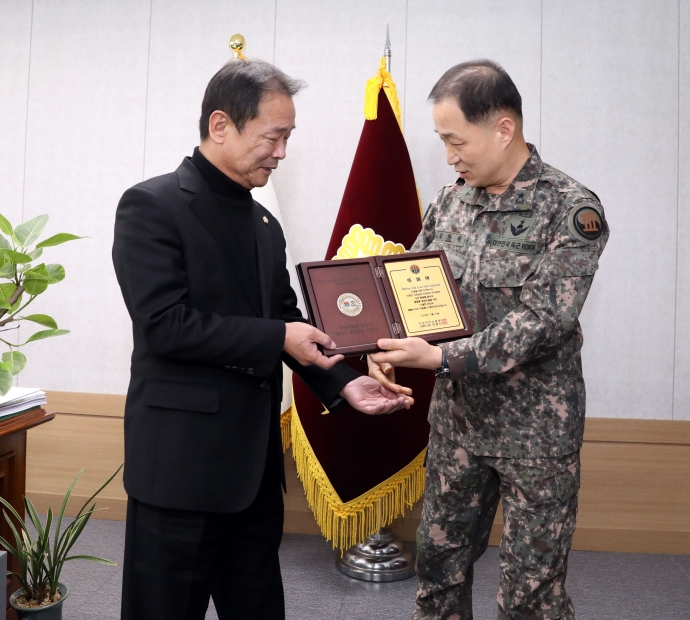 2023년 1월 19일(목) 14:00 의장실에서 이춘만의장에게 "예비군 육성 우수지빙자치단체" 감사패을 3군단에서 전달하였다.