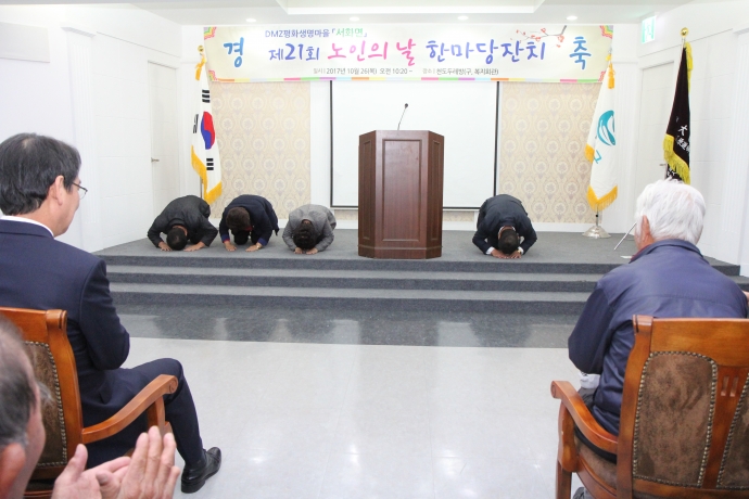 2017년 10월 26일(목) 11:00 천도두레방(구 복지회관)에서 본의회 한의동의장 및 군의원들(엄윤순부의장, 강순복의원, 최덕용의원)은 【서화면 제21회 노인의 날 행사 개회식】에 참석하여 축하해 주었다.