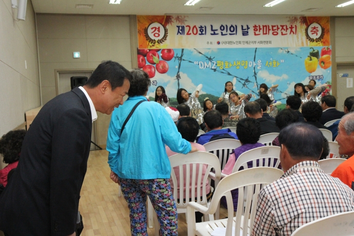 2016년 10월 17일(월) 11:00 서화면 주민대피시설에서 인제군의회한의동의장과 엄윤순부의장, 강순복의원, 이춘만의원, 최덕용의원은 【제20회 노인의날 기념 한마당 잔치】에 참석하여 축하 격려해주었다.